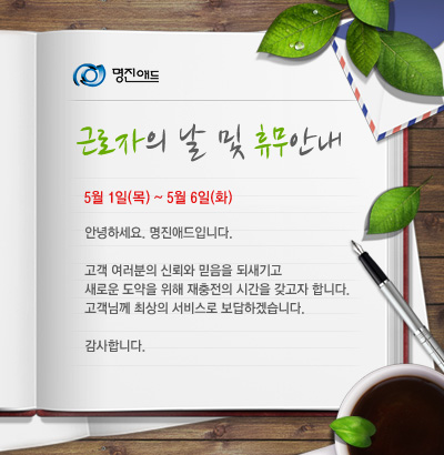 근로자의 날 및 휴무안내 5월1일(목)~5월 6일(화) 안녕하세요. 명진애드입니다. 고객 여러분의 신뢰와 믿음을 되새기고 새로운 도약을 위해 재충전의 시간을 갖고자 합니다. 고객님께 최상의 서비스로 보답하겠습니다. 감사합니다.