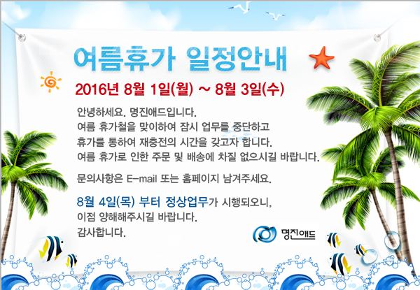 여름휴가 일정안내 2016년 8월 1일 (월) ~ 8월 3일 (수) 안녕하세요. 명진애드입니다. 여름 휴가철을 맞이하여 잠시 업무를 중단하고 휴가를 통하여 재충전의 시간을 갖고자 합니다. 여름 휴가로 인한 주문 및 배송에 차질 없으시길 바랍니다. 문의사항은 E-mail 또는 홈페이지 남겨주세요. 8월 4일(목) 부터 정상업무가 시행되오니, 이점 양해해주시길 바랍니다. 감사합니다.
