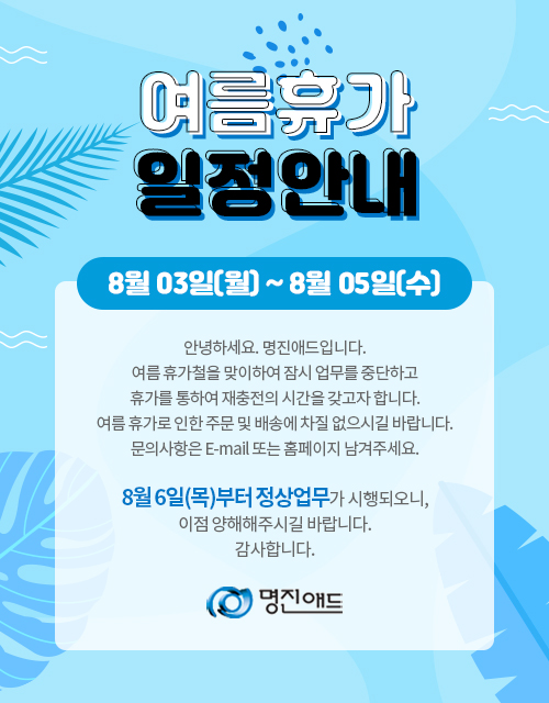 여름휴가 일정안내 입니다. 8월 03일(월) ~ 8월 05일(수) 안녕하세요. 명진애드입니다. 여름 휴가철을 맞이하여 잠시 업무를 중단하고 휴가를 통하여 재충전의 시간을 갖고자 합니다. 여름 휴가로 인한 주문 및 배송에 차질 없으시길 바랍니다. 문의사항은 E-mail 또는 홈페이지 남겨주세요. 8월 6일(목)부터 정상업무가 시행되오니, 이점 양해해주시길 바랍니다. 감사합니다.