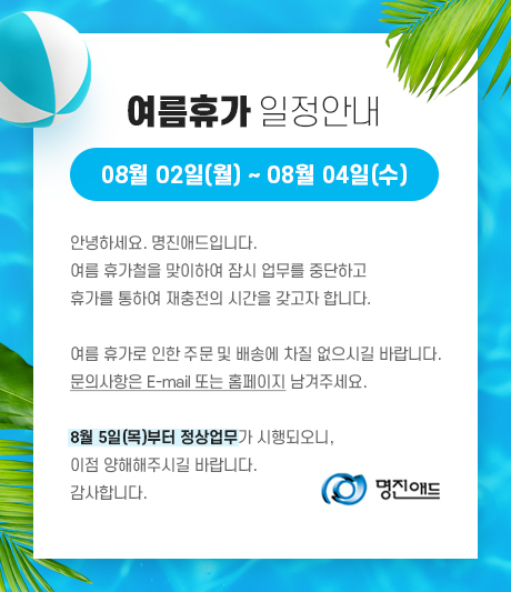 안녕하세요. 명진애드입니다. 2021년 여름휴가 일정안내 입니다. 8월 02일(월) ~ 8월 04일(수) 여름 휴가철을 맞이하여 잠시 업무를 중단하고 휴가를 통하여 재충전의 시간을 갖고자 합니다. 문의사항은 E-mail로 남겨주세요. 8월 5일(목)부터 정상업무가 시행되오니, 이점 양해해주시길 바랍니다. 감사합니다.