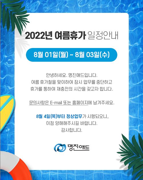 안녕하세요. 명진애드입니다. 2022년 여름휴가 일정안내 입니다. 8월 01일(월) ~ 8월 03일(수) 여름 휴가철을 맞이하여 잠시 업무를 중단하고 휴가를 통하여 재충전의 시간을 갖고자 합니다. 문의사항은 E-mail 또는 홈페이지에 남겨주세요. 8월 4일(목)부터 정상업무가 시행되오니, 이점 양해해주시길 바랍니다. 감사합니다.