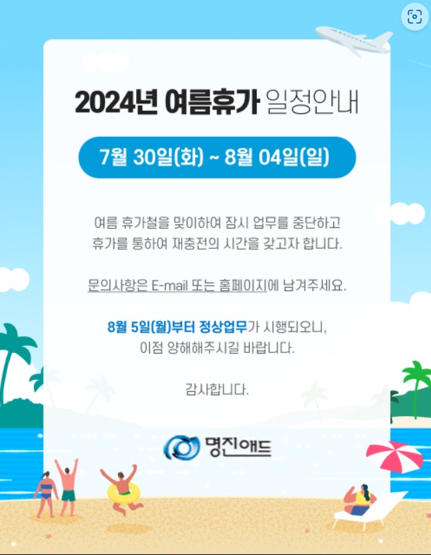 안녕하세요. 명진애드입니다. 24년 여름휴가 일정안내 입니다. 7월 30일(화) ~ 8월 04일(일)까지 하계 여름 휴가 입니다. 8월 5일(월)부터 정상업무가 시행되오니, 이점 양해해주시길 바랍니다. 감사합니다