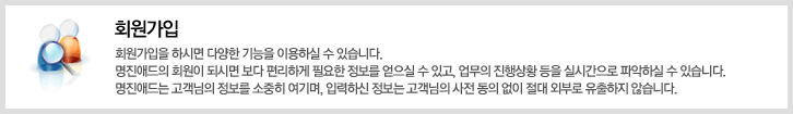 제1장 총 칙 제1조 목 적 이 약관은 명진애드에서 제공하는 인쇄물서비스의 이용조건 및 절차에 관한 사항과 기타 필요한 사항을 규정함을 목적으로 합니다. 제2조 약관의 효력과 변경 (1) 약관은 이용자에게 공시함으로서 효력을 발생합니다. (2) 회사는 사정 변경의 경우와 영업상 중요 사유가 있을 때 약관을 변경할 수 있으며, 변경된 약관은 전항과 같은 방법으로 효력을 발생합니다. 제3조 약관 외 준칙 이 약관에 명시되지 않은 사항이 관계법령에 규정되어 있을 경우에는 그 규정에 따릅니다. 제2장 회원 가입과 서비스 이용 제1조 이용 계약의 성립 (1) 이용 계약은 이용자의 이용 신청에 대한 회사의 이용 응낙과 이용자의 약관 내용에 대한 동의로 성립됩니다. (2) 회원에 가입하여 서비스를 이용하고자 하는 희망자는 회사에서 요청하는 개인 신상정보를 제공해야 합니다. (3) 회사는 다음 각 호에 해당하는 이용계약신청에 대하여는 이를 응낙하지 아니합니다. ① 다른 사람의 명의를 사용하여 신청하였을 때 ② 이용 계약 신청서의 내용을 허위로 기재하였거나 허위서류를 첨부하여 신청하였을 때 ③ 사회의 안녕 질서 혹은 미풍양속을 저해할 목적으로 신청하였을 때 제2조 서비스 이용 (1) 서비스 이용은 회사의 업무상 또는 기술상 특별한 지장이 없는 한 연중 무휴, 1일 24시간을 원칙으로 합니다. (2) 제1항의 이용시간은 정기점검 등의 필요로 인하여 회사가 정한 날 또는 시간은 그러하지 아니합니다. 제3장 책 임 제1조 회사의 의무 (1) 회사는 특별한 사정이 없는 한 이용자가 신청한 서비스 제공 개시일에 서비스를 이용할 수 있도록 합니다. (2) 회사는 이 약관에서 정한 바에 따라 계속적, 안정적으로 서비스를 제공할 의무가 있습니다. (3) 회사는 이용자의 개인 신상 정보를 본인의 승낙 없이 타인에게 누설, 배포하여서는 아니 됩니다. 다만, 전기통신관련법령 등 관계법령에 의하여 관계 국가기관 등의 요구가 있는 경우에는 그러하지 아니합니다. (4) 회사는 이용자로부터 제기되는 의견이나 불만이 정당하다고 인정할 경우 에는 즉시 처리하여야 합니다. 다만, 즉시 처리가 곤란한 경우에는 이용자에게 그 사유와 처리일정을 통보하여야 합니다. 제2조 이용자의 의무 (1) 아이디와 비밀 번호에 관한 모든 관리의 책임은 이용자에게 있습니다. (2) 자신의 아이디가 부정하게 사용된 경우, 이용자은 반드시 회사에 그 사실을 통보해야 합니다. (3) 이용자는 이 약관 및 관계법령에서 규정한 사항을 준수하여야 합니다. 제4장 계약 해지 및 서비스 이용제한 제1조 계약 해지 및 이용제한 회사는 이용자가 다음 사항에 해당하는 행위를 하였을 경우 사전 통지 없이 이용 계약을 해지 하거나 또는 기간을 정하여 서비스 이용을 중지할 수 있습니다. (1) 공공 질서 및 미풍 양속에 반하는 경우 (2) 범죄적 행위에 관련되는 경우 (3) 이용자가 국익 또는 사회적 공익을 저해할 목적으로 서비스 이용을 계획 또는 실행 할 경우 (4) 타인의 서비스 아이디 및 비밀 번호를 도용한 경우 (5) 타인의 명예를 손상시키거나 불이익을 주는 경우 (6) 서비스에 위해를 가하는 등 서비스의 건전한 이용을 저해하는 경우 (7) 기타 관련법령이나 회사가 정한 이용조건에 위배되는 경우 제2조 이용 제한의 해제 절차 (1) 회사는 제1조의 규정에 의하여 이용제한을 하고자 하는 경우에는 그 사유, 일시 및 기간을 정하여 서면 또는 전화 등의 방법에 의하여 해당 이용자 또는 대리인에게 통지합니다. 다만, 회사가 긴급하게 이용을 정지할 필요가 있다고 인정하는 경우에는 그러하지 아니합니다. (2) 제1항의 규정에 의하여 이용정지의 통지를 받은 이용자 또는 그 대리인은 그 이용정지의 통지에 대하여 이의가 있을 때에는 이의신청을 할 수 있습니다. (3) 회사는 제2항의 규정에 의한 이의신청에 대하여 그 확인을 위한 기간까지 이용정지를 일시 연기할 수 있으며, 그 결과를 이용자 또는 그 대리인에게 통지합니다. (4) 회사는 이용정지 기간 중에 그 이용정지 사유가 해소된 것이 확인된 경우에는 이용 정지조치를 즉시 해제합니다. 제3조 이용자의 게시물 회사는 이용자가 게시하거나 등록하는 서비스 내의 내용물이 다음 각 사항에 해당 된다고 판단되는 경우에 사전 통지 없이 삭제할 수 있습니다. (1) 다른 이용자 또는 제 3자를 비방하거나 중상 모략으로 명예를 손상시키는 내용인 경우 (2) 공공질서 및 미풍 양속에 위반되는 내용인 경우 (3) 범죄적 행위에 결부된다고 인정되는 내용일 경우 (4) 제 3자의 저작권 등 기타 권리를 침해하는 내용인 경우 (5) 기타 관계 법령이나 회사에서 정한 규정에 위배되는 경우 제5장 계약변경 제1조 계약사항의 변경 (1) 이용자는 주소 연락처 등 이용계약 내용(회원 정보)을 변경하고자 할 경우, 홈페이지의 회원정보변경란을 통해서 변경할 수 있으며, 이 경우에도 신규 가입시와 마찬가지로 허위사실을 기재할 경우, 서비스에 불이익을받으실 수 있습니다 (2) 이용자가 해지를 원할 경우 회원탈퇴란에서 해지가 가능하며, 또는 전화나 팩스, 전자우편을 통해 본인임이 확인될 경우에만 해지가 가능합니다. 제6장 정보의